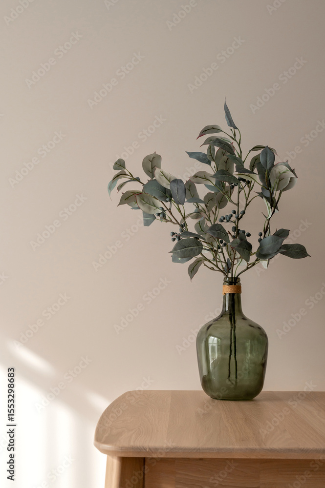 Green vase with olive plant branch on wooden table top, on neutral beige plaster wall background with natural sunlight shadow, aesthetic minimal home interior decor #1553298683