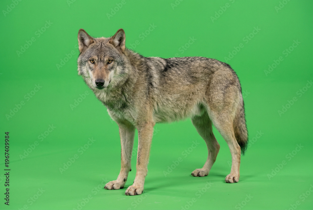Grey forest wolf on green screen chroma key background. #1967409984