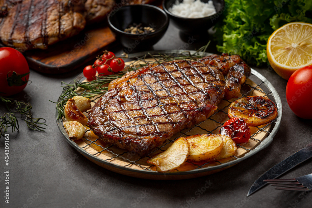 Grilled beef steak steak on the dark background. #434309168