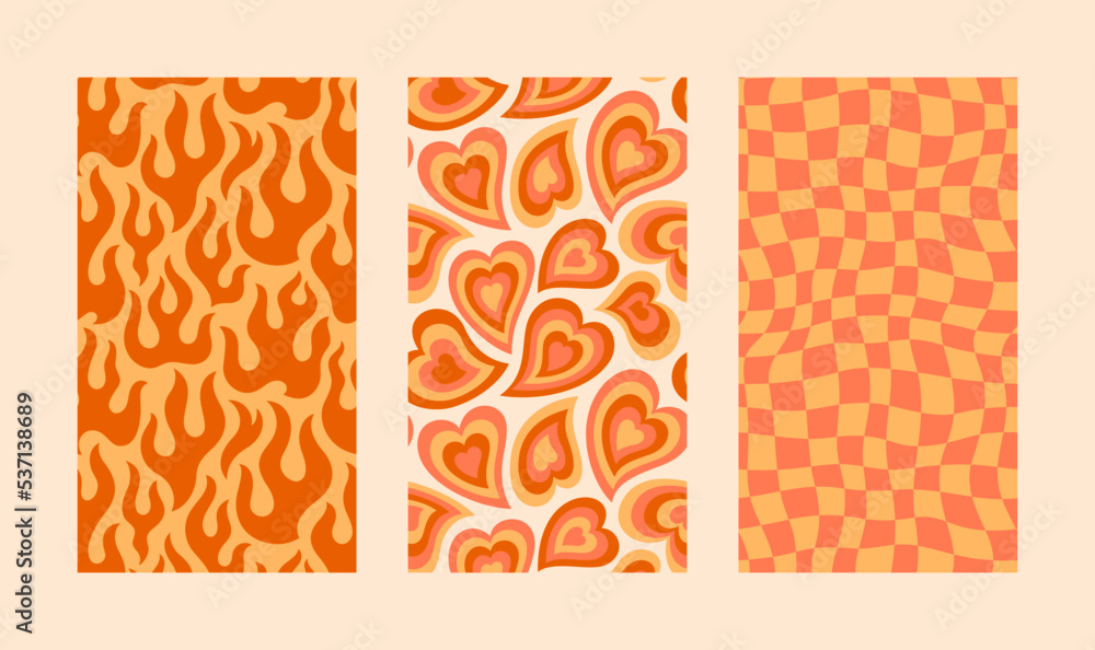 Groovy Hippie 70s Backgrounds Set. Vector Psychedelic Wallpapers: Rainbow Hearts, Checkerboards, Fires #537138689