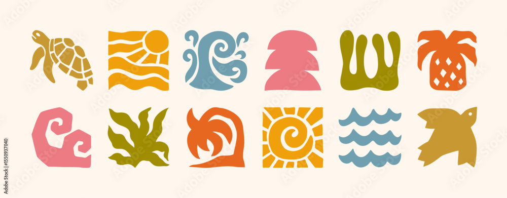 Groovy Summer Icons in Boho Style. Vector Abstract Square Tropical Illustrations in Freehand. Geometric Bird, Sun, Sea Wave, Palm, Flower, Pineapple and Turtle for Logo, Patterns, Print, Stickers #1550937040