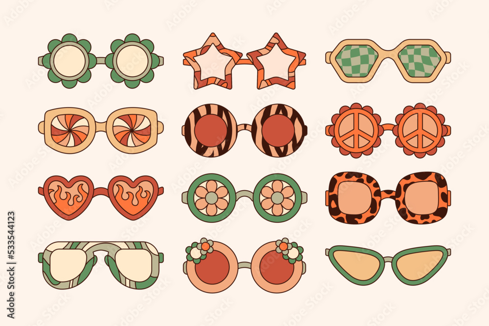 Groovy Sunglasses Set in Retro Hippie Style . Geometric Abstract Vector Eyewear in 1970s in Different Forms #533544123