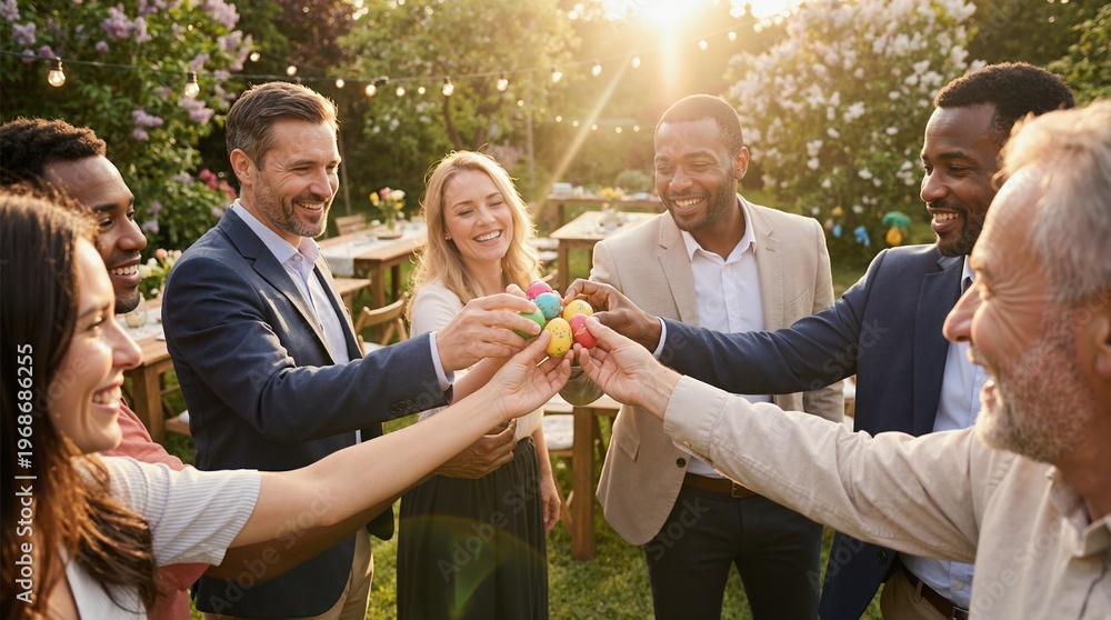 Group of elegant friends holding Easter eggs together in sunny garden. Diverse people celebrating at outdoor spring party #1968686255