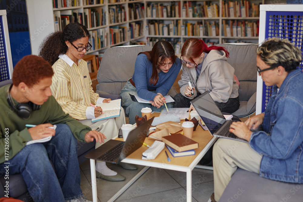 Group of multiethnic teenagers collaborating on project, using laptops and writing in notebooks while sitting around table in library, focused on studying and sharing ideas together #1773260063
