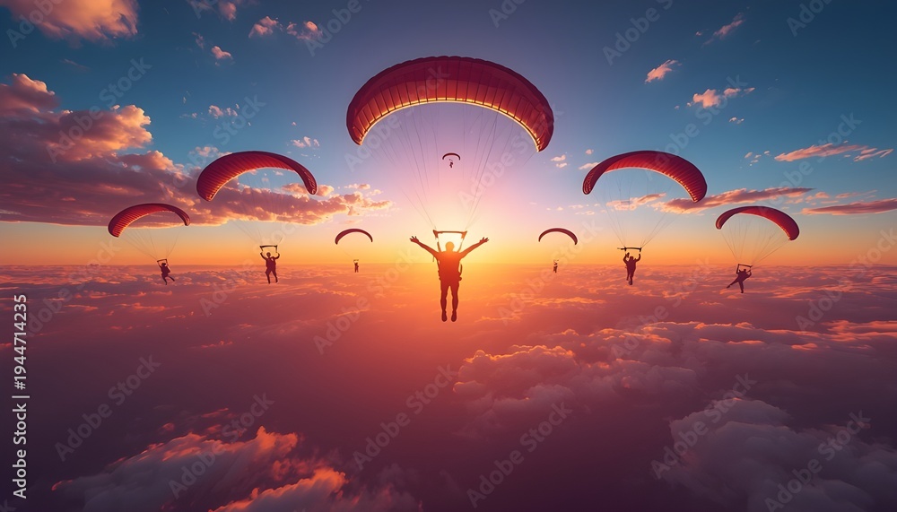 Group of paragliders soaring high above a dense blanket of pink and orange sunset clouds during an exhilarating extreme sports adventure flight #1944714235