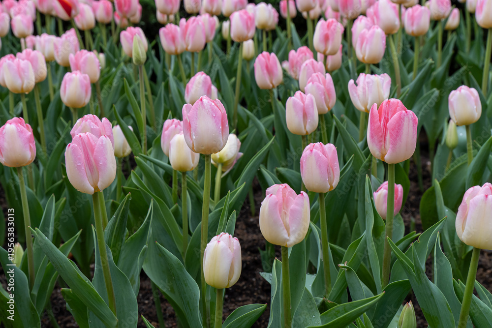 Group of pink tulips growing in a garden during spring season with green leaves and brown soil around them #1956383013