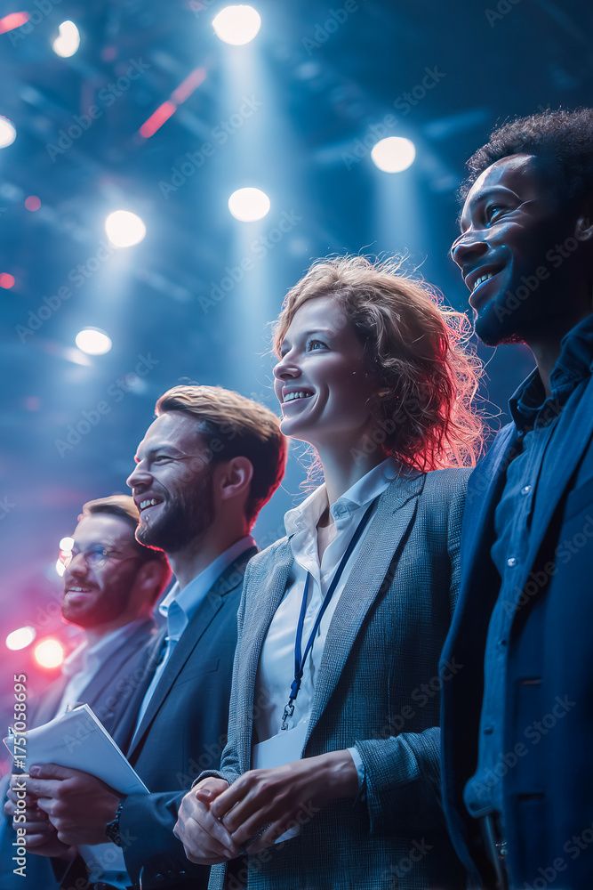 Group of professionals enjoying an event with bright stage lights in an indoor venue at night #1751058695