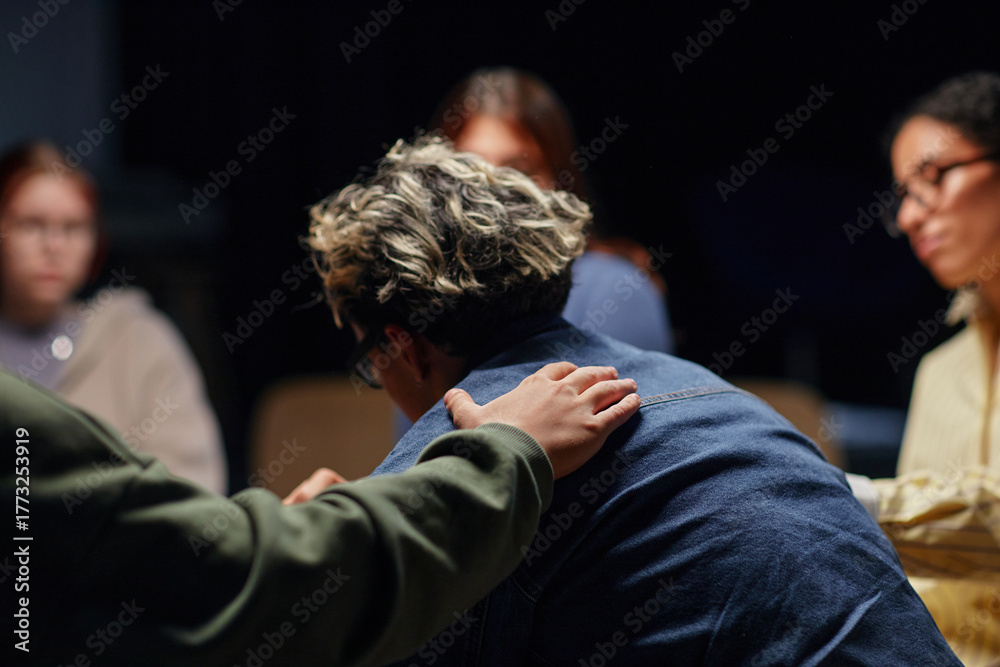 Group of young adult people sitting together, one person comforting another by placing hand on shoulder, diverse group engaging in supportive conversation indoors #1773253919
