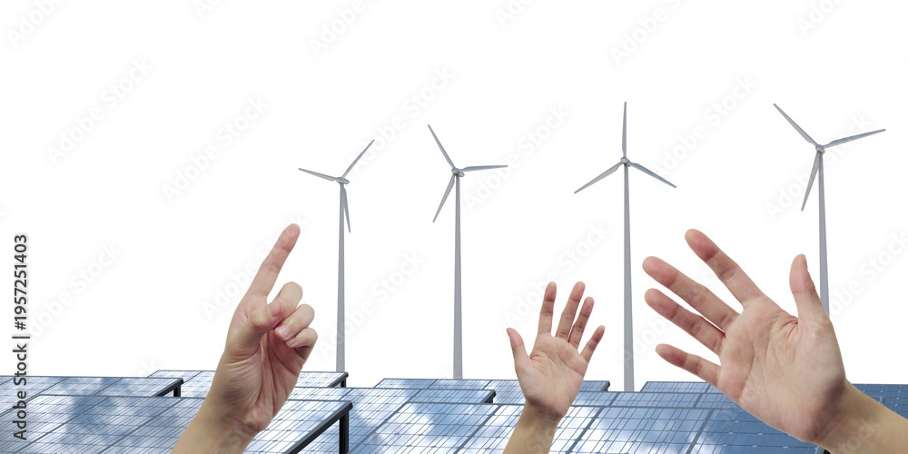 Growth of clean energy and a sustainable future with a hand reaching out to wind turbines and solar panels. 3d rendering, Illustration #1957251403