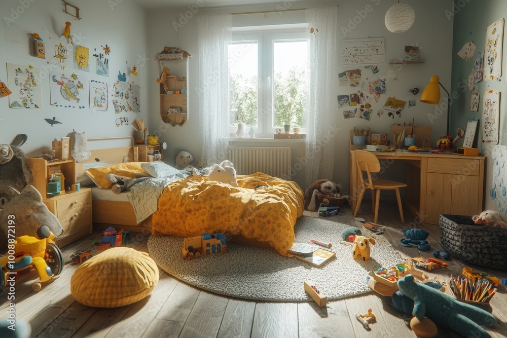 Habitación infantil real con juguetes esparcidos por el suelo y una cama deshecha. La luz natural ilumina el espacio, creando un ambiente cálido a pesar del desorden. #1008872193