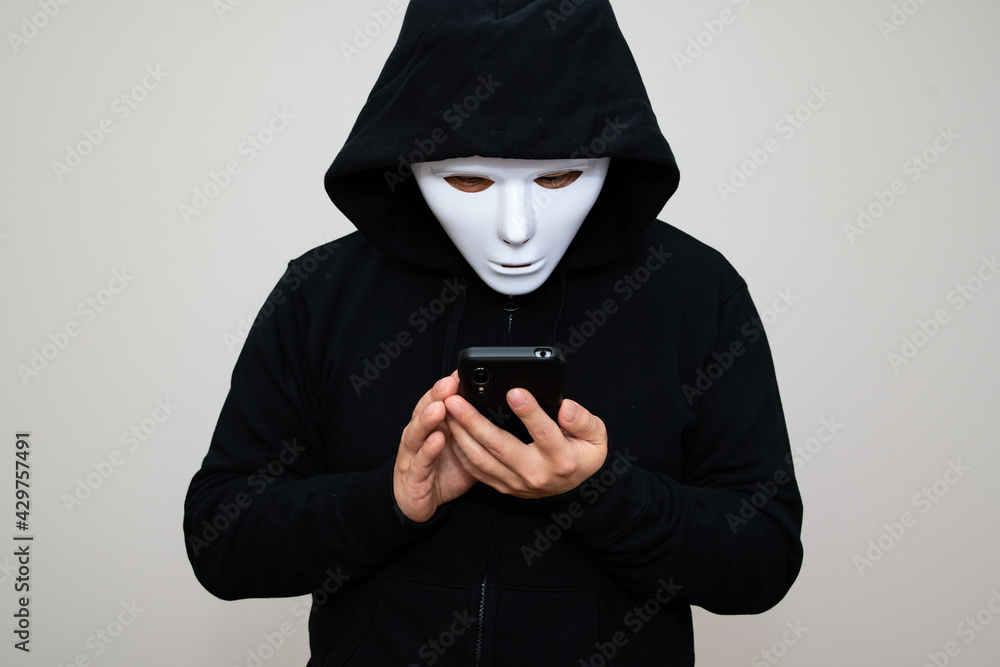 Hacker with anonymous mask holding his phone #429757491