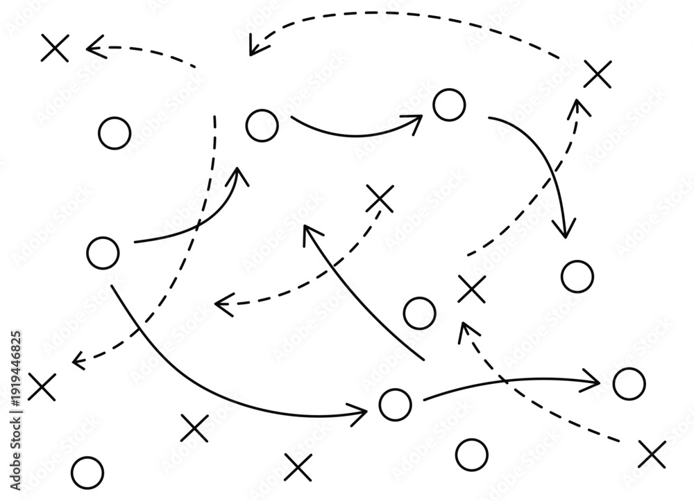 Hand draw strategy game plan for football, basketball, handball, sketched black marker, isolated on white, clipping path, design elements. Sketch style illustration of arrows with X and O symbols. #1919446825