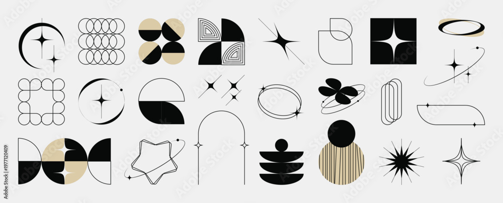 Hand drawn abstract minimal element mid century vector set. Aesthetic contemporary stripe line art, geometric shape in monochrome. Art form design for wall art, decoration, wallpaper. #1977120409