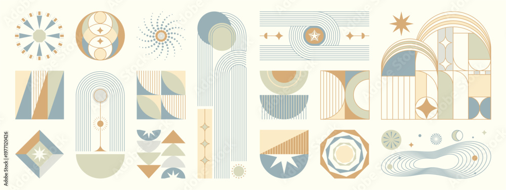Hand drawn abstract minimal element mid century vector set. Aesthetic contemporary stripe line art, geometric shape in monochrome. Art form design for wall art, decoration, wallpaper. #1977120426