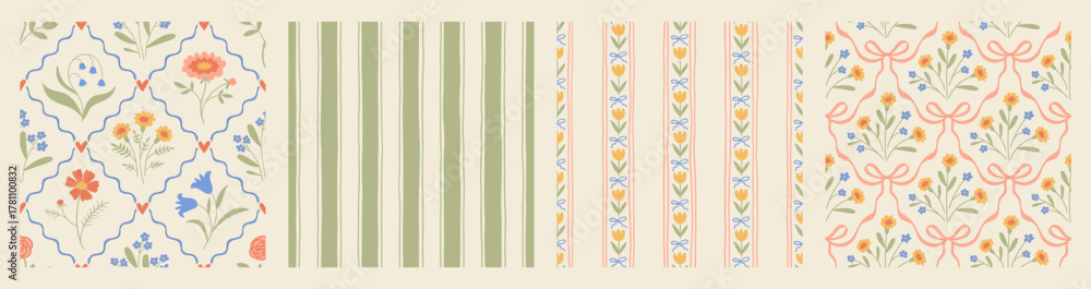 Hand drawn coquette seamless pattern collection with a charming floral whimsical design. Soft, pastel and nostalgic, perfect for textiles, wallpaper, wrapping paper and romantic vintage decor. #1781100832