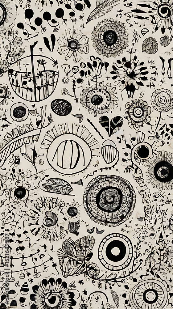 Hand-drawn doodle pattern with whimsical elements, black ink on white background, casual and fun aesthetic#1521649987