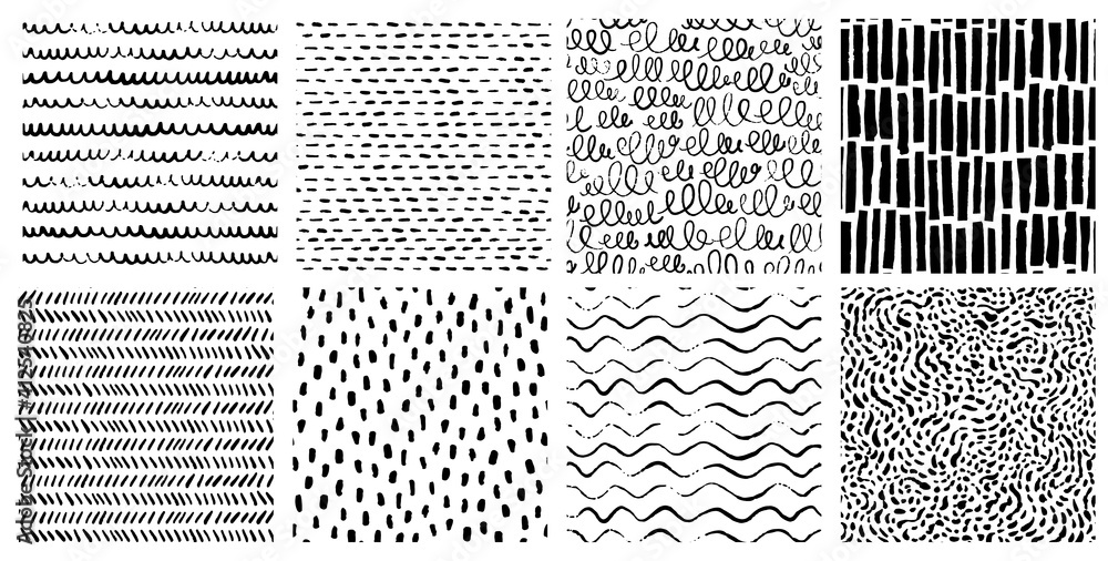 Hand drawn ink pattern and textures set. Expressive seamless abstract vector backgrounds in black and white. Trendy monochrome doodles and brush marks. #412540825
