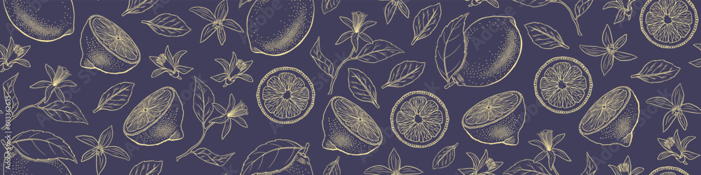 Hand drawn lemon seamless pattern. Outline citrus fruit with flowers and leaves. Vector illustration. #603362635