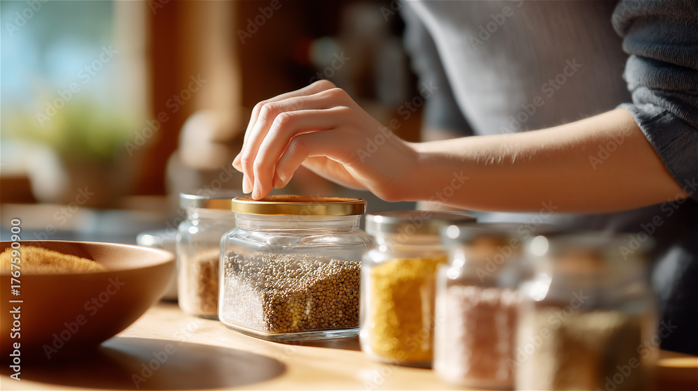 Hands arranging glass jars with grains and spices in kitchen, concept of zero waste, sustainability and home organization. #1767590900