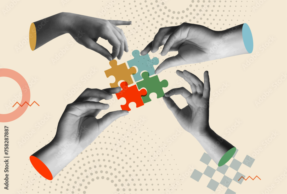 Hands holding colorful puzzle pieces in retro collage vector illustration #758287887