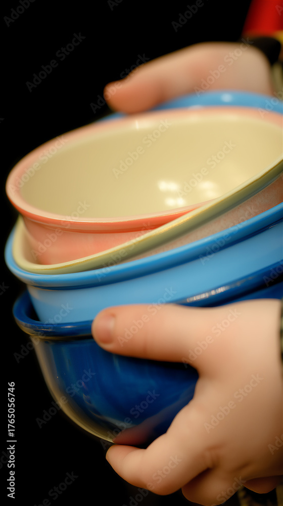 Hands holding stack of colorful ceramic bowls against dark background, concept of minimalism, kitchenware and modern lifestyle. #1765056746