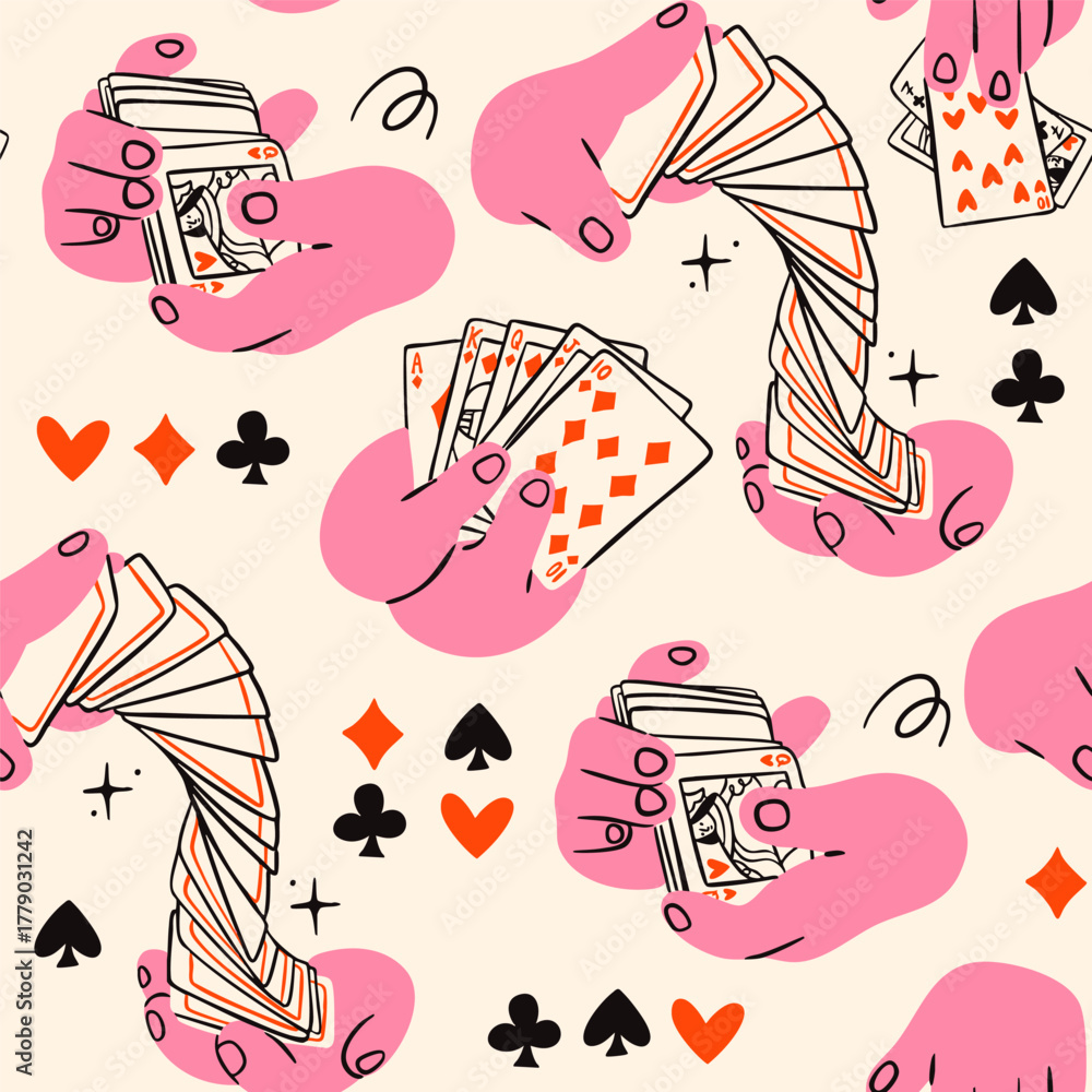 Hands shuffle, hold, take cards, playing cards, card suits. Hand drawn trendy Vector illustration. Tournament, casino, poker, gambling, game, croupier, entertainment concept. Square seamless Pattern #1779031242