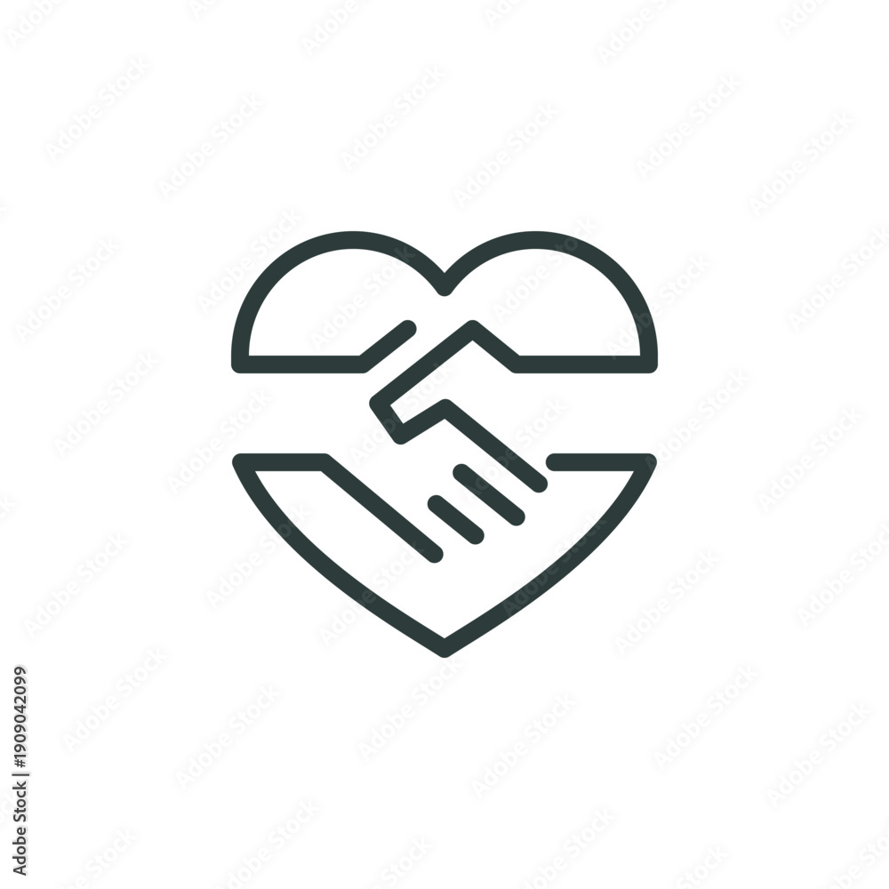 Handshake friendly agreement partnership deal, corporate trust contract thin outline icon. Minimalist line sign two hands shaking each other in heart symbol. Vector isolated pictogram for web and app. #1909042099