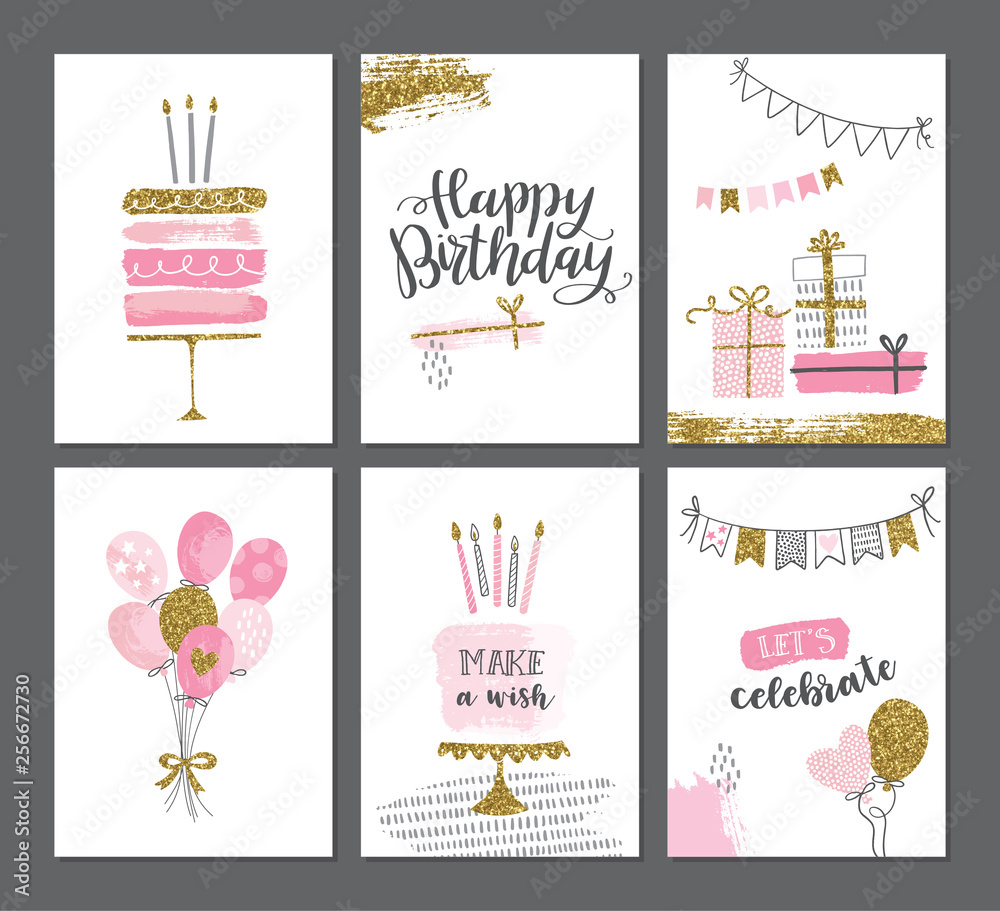Happy birthday greeting card and party invitation templates with gold glitter. Women birthday vector illustration, hand drawn style. #256672730