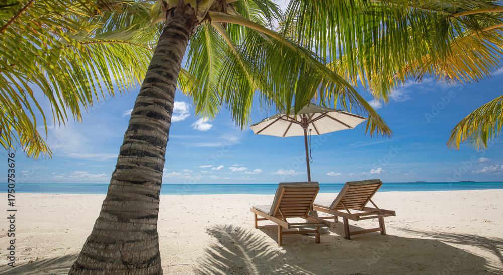 Happy couple love beach landscape two chairs umbrella palm leaves sunny sea view relax summer holiday honeymoon travel together tropical island paradise ocean horizon blue sky vacation leisure romance #1750753676
