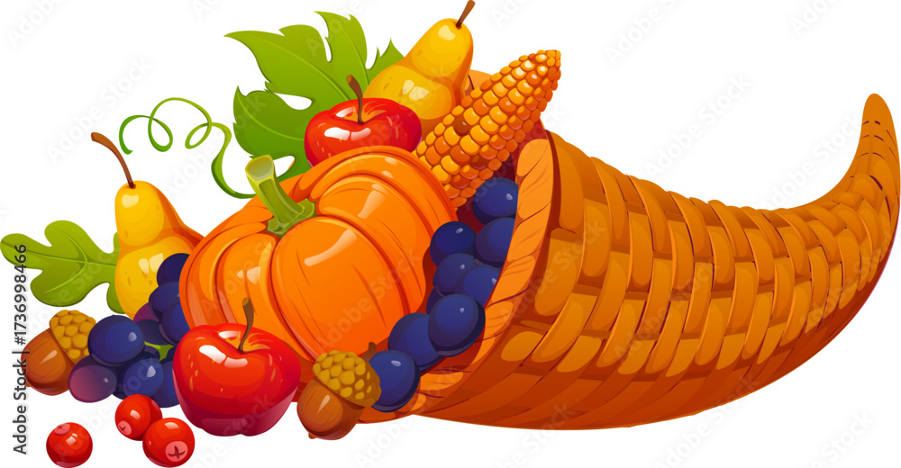 Happy Thanksgiving Day autumn harvest food icon for fall holiday, cartoon vector. Cornucopia horn with autumn harvest of pumpkins, fruits, and vegetables for Thanksgiving holiday greeting #1736998466