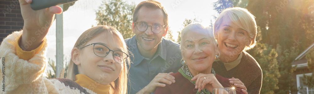 Header of teenage Caucasian girl taking selfie with middle aged Caucasian man, senior Caucasian woman, middle aged Caucasian woman smiling outdoors, all looking at smartphone camera #1772363523
