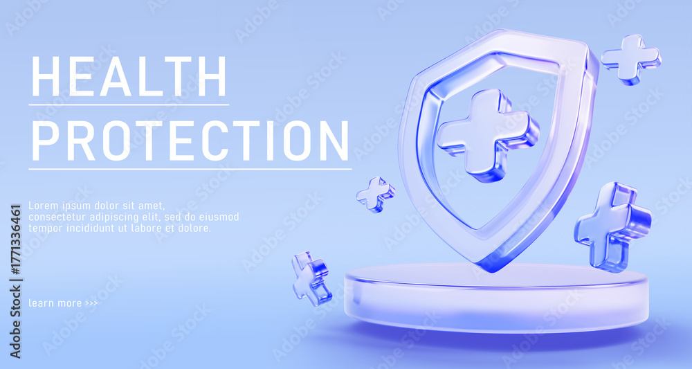 Health protection 3d banner. Medical podium with glass holographic shield, plus symbol and floating cross sign on blue background. Healthcare security platform, life insurance concept. 3D illustration #1771336461