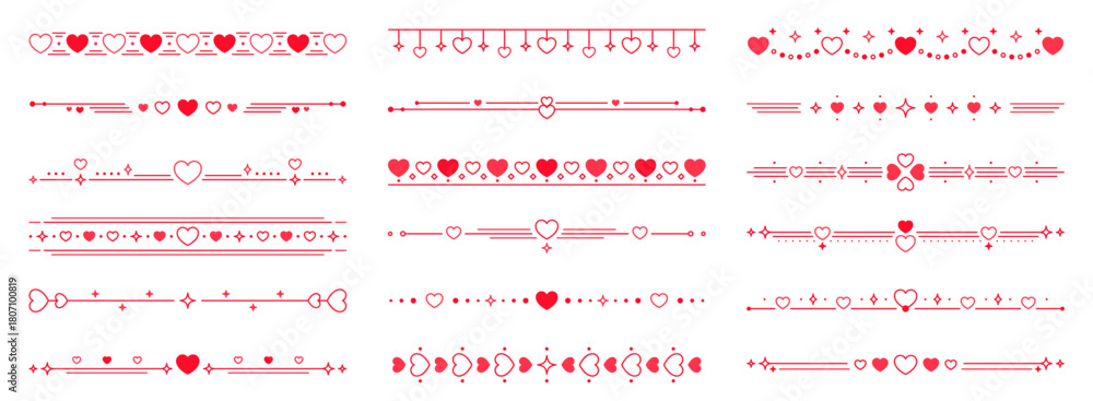 Heart dividers and borders for Valentines day decorations. Love holiday linear vector separator lines, romantic outline underline spacer. St Valentine day dividers or frame borders set with hearts #1807100819