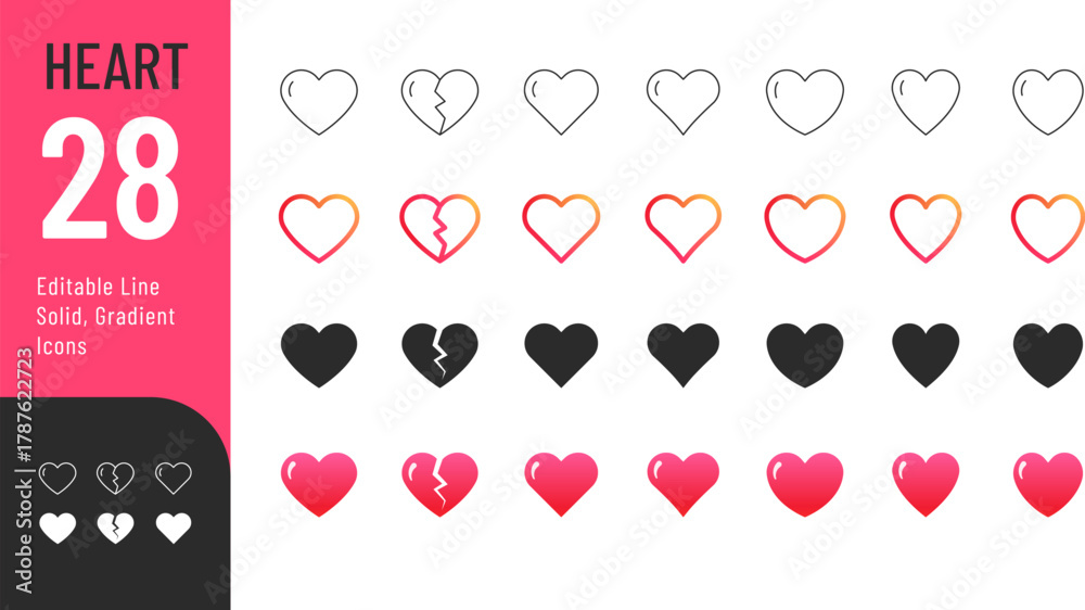 Heart Shape Icons set. Vector Illustration of hearts of various shapes in the form of editable thin line, linear gradient, black fill, and volumetric icons. Isolated on transparent background. #1787622723