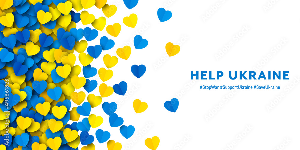 Help Ukraine Vector Scattered Yellow Blue Paper Hearts Border Isolated On White Background. Stop War And Save Ukraine Illustration. Ukrainian National Flag Colours Abstract Wide Banner Or Wallpaper #495661823