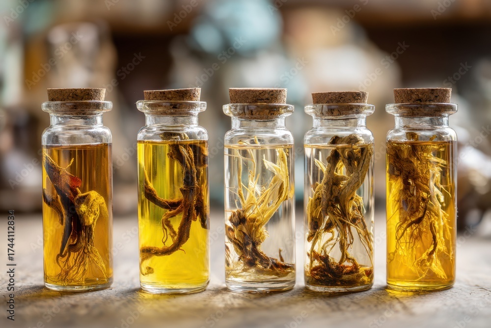 Herbal Roots in Bottles: Natural Remedies and Botanical Extracts Display. #1744112834