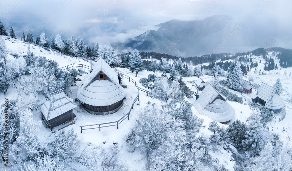 High-resolution panoramic view of Velika Planina alpine village with traditional wooden shepherd huts in winter snow, Slovenia. aerial drone view #1863060487