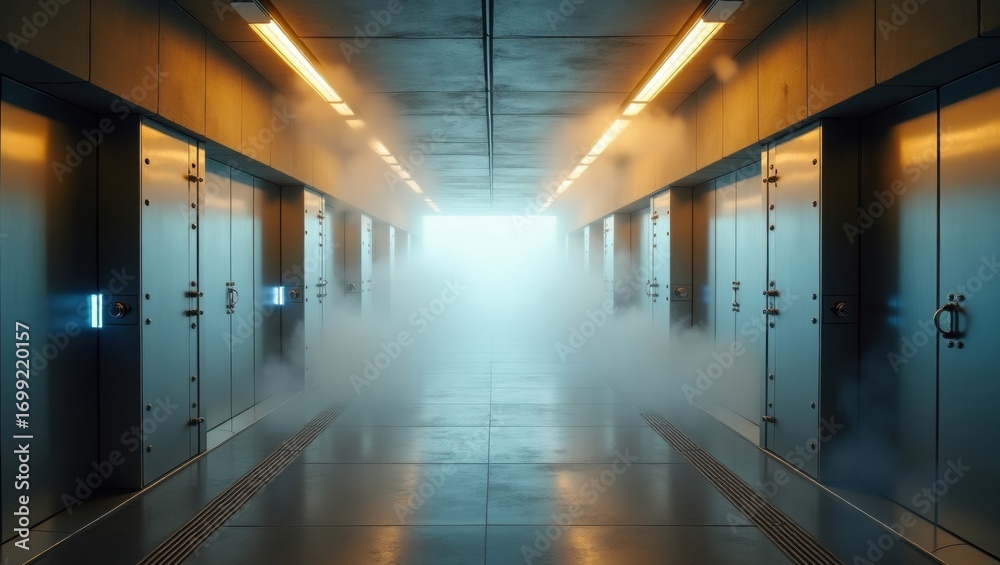 High-tech underground tunnel with sliding metal doors, and steam rising from floor vents #1699220157