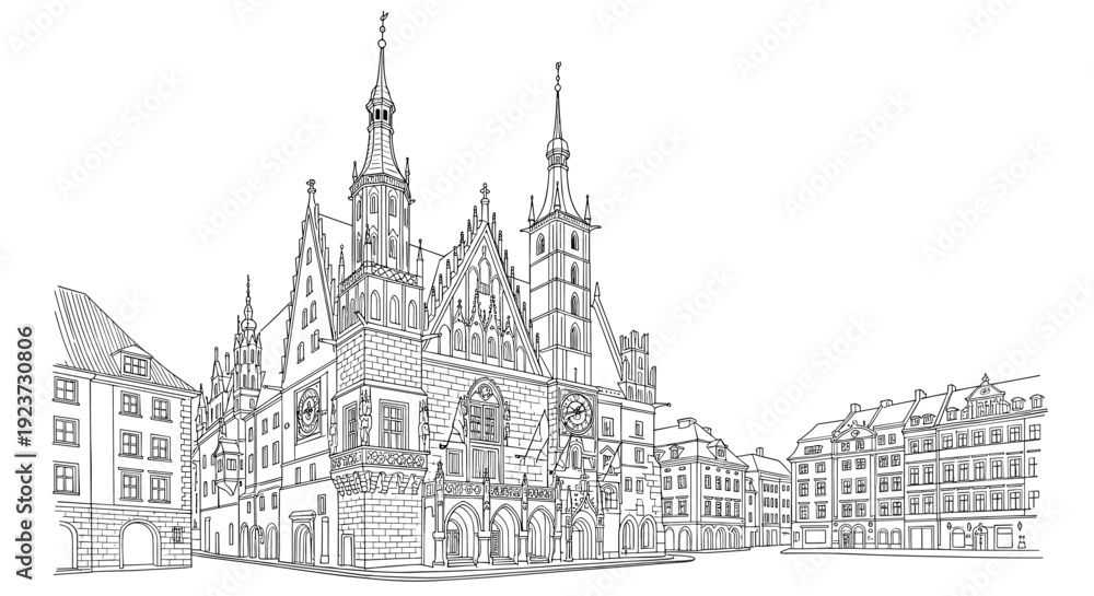 Historic european architecture in detailed line art of gothic urban scene #1923730806