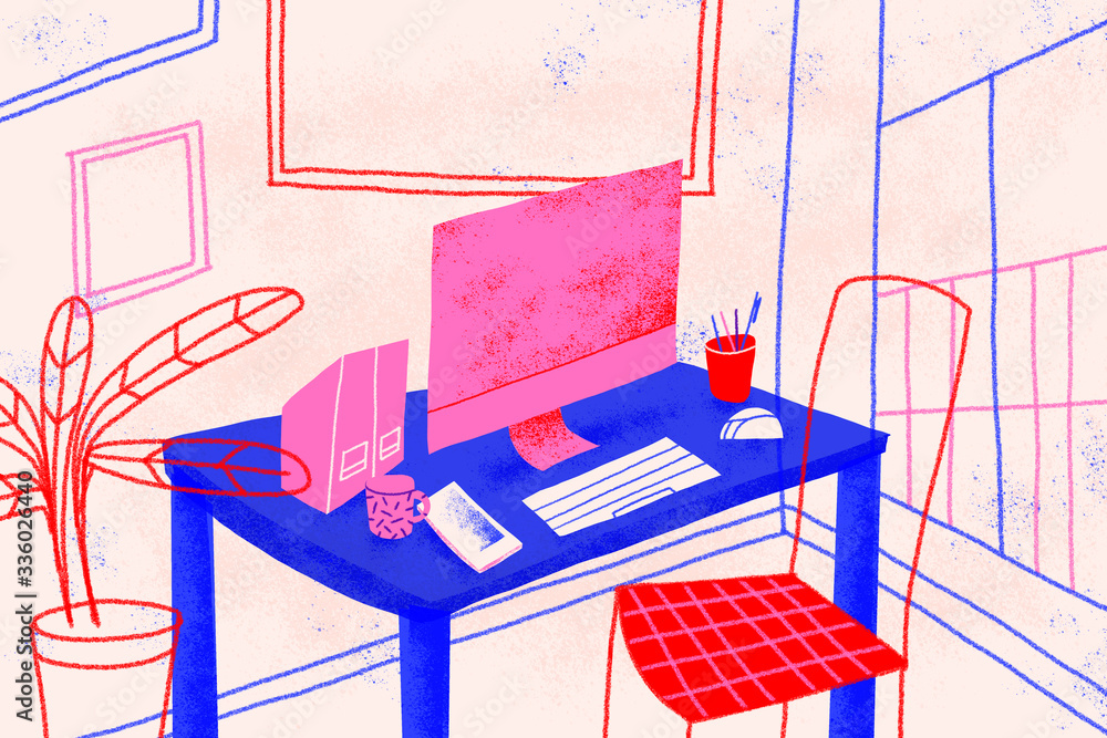 Home office. Workplace. Conceptual illustration shows a house room ready for telecommuting. Working from home concept. Colorful. #336026440