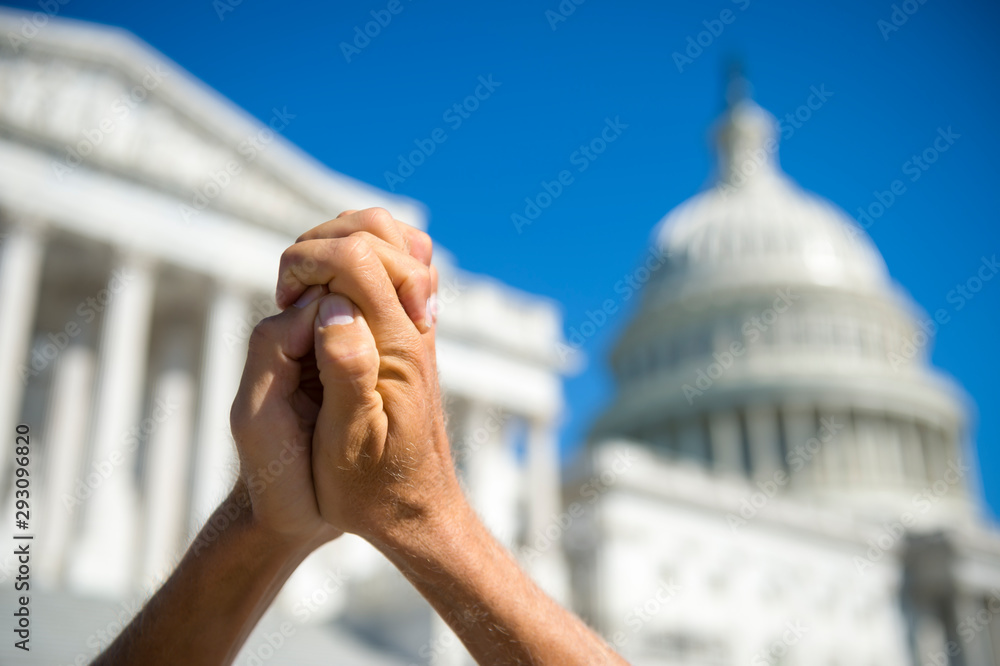 Hopeful hands clasped together in prayer in front of a bright view of the Capitol Building in Washington DC, USA #293096820