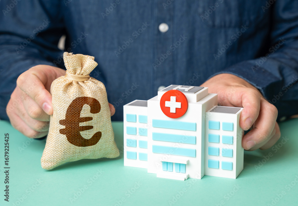 Hospital and euro money bag, health financing, medical funding, public investment, healthcare economy, innovation in medicine #1679225425