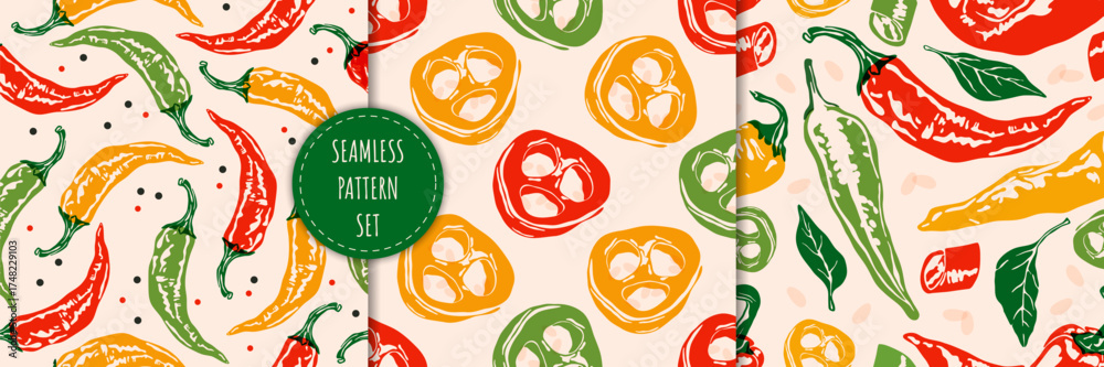 Hot pepper pattern set. Seamless print of spicy paprika vegetables, cartoon chili cayenne jalapeno organic plants, vintage garden food backgrounds. Vector texture collection #1748229103