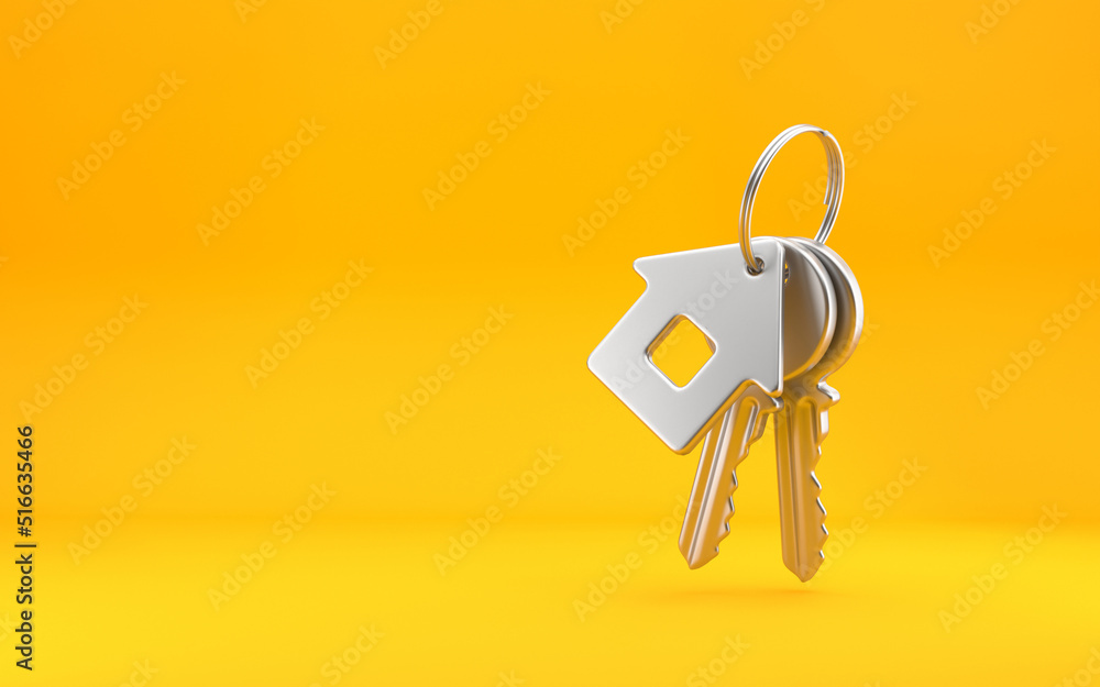 House keys with house shaped keychain, Estate concept, key ring and keys on bright yellow background. 3d rendering #516635466