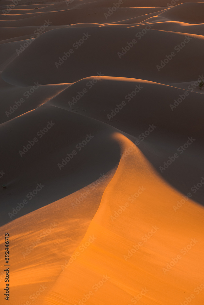 Huge desert dunes of Erg Chigaga, at the gates of the Sahara, al amanecer. Morocco. Concept of travel and adventure. #392446713