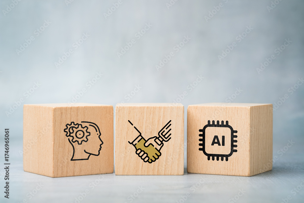 Human and AI Collaboration Concept with Handshake Icon on Wooden Blocks #1746965061