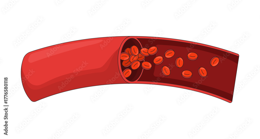 Human artery cross-section with red blood cells 2D vector illustration. Internal circulation. Erythrocytes flowing through vessel flat object isolated on white background. Colorful cartoon image #1776580118