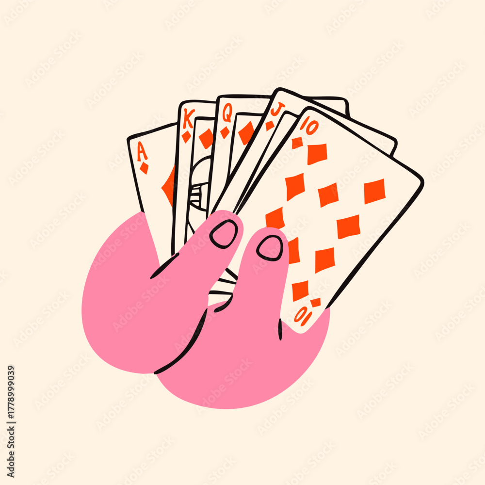 Human hands hold playing cards. Diamonds Royal flush. Hand drawn trendy Vector illustration. Tournament, casino, poker, gambling, game, croupier, entertainment concept. Isolated design element #1778999039
