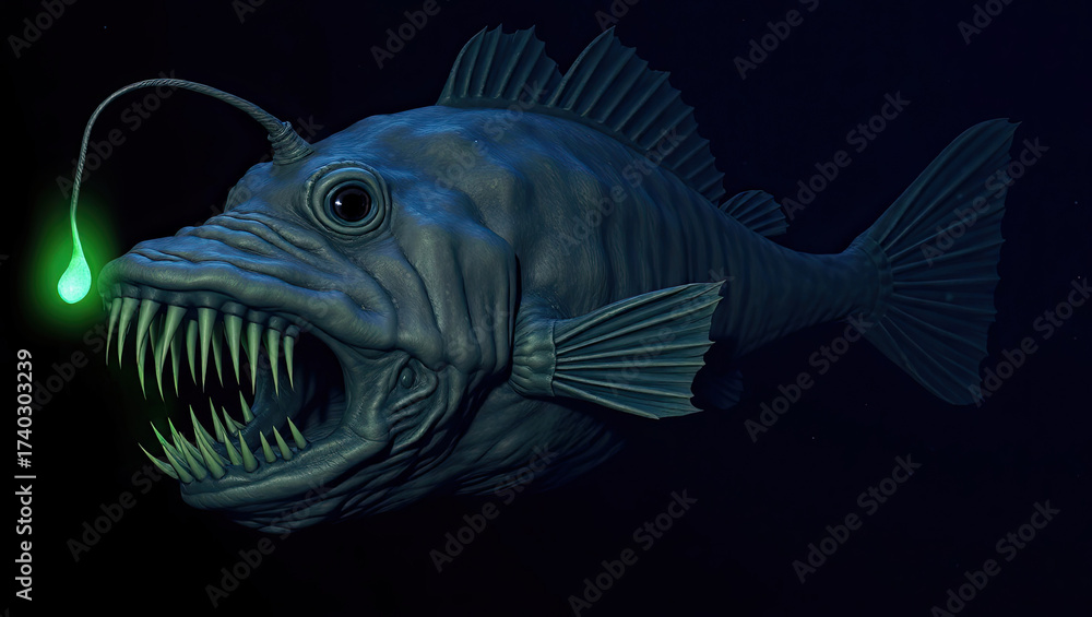 Humpback Anglerfish, Melanocetus johnsonii, using its bioluminescent lure to attract prey in the dark depths of the ocean, showcasing its unique adaptation for hunting in extreme environments #1740303239