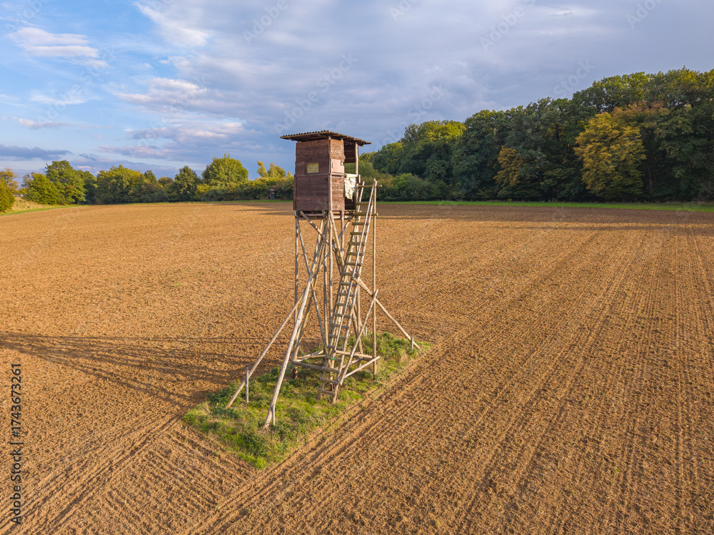 Hunting blind, high seat in the middle of a field with the forest in the background #1743673261